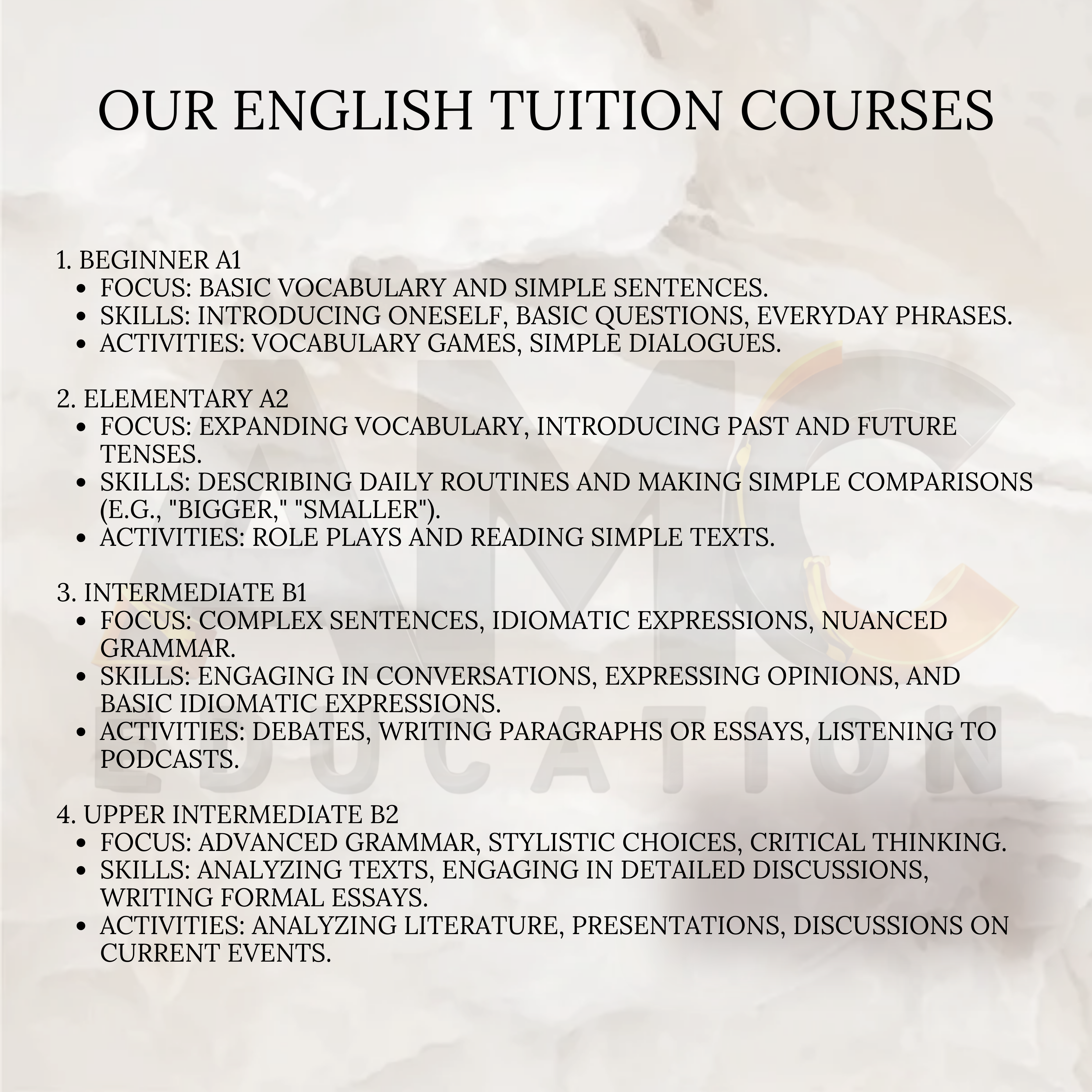 Whether you’re just starting or looking to polish your skills, our courses are designed for everyone who wants to learn or improve their English. At AMC Education, we are dedicated to helping individuals of all backgrounds unlock their potential through English language learning. Our mission is to provide high-quality English as a Foreign Language (EFL) courses designed for anyone looking to learn or improve their English skills. Our courses focus not only on language proficiency but also on building confidence in speaking, listening, reading, and writing. We believe that every learner deserves the opportunity to communicate effectively in English and achieve their goals. Choose from one-on-one sessions or join one of our small group classes (with just 3-4 students), where you can learn in a relaxed, friendly environment. Our instructors are here to make learning fun and effective, guiding you every step of the way. We can’t wait to help you succeed!